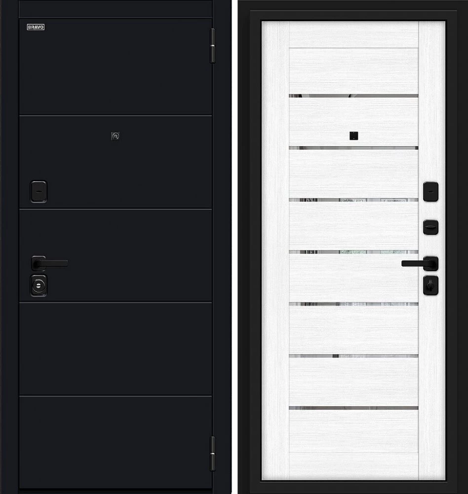 Надежная входная Дверь Браво Прайд Total Black/Snow Melinga премиум класса по цене 40 401 руб. Большая толщина стали защитит от проникновения в ваш дом, квартиру или коттедж. Используется очень качественная фурнитура: замки, цилиндры, ручки, защелки. Покрытие и отделка двери изготовлено под внимательным контролем производителя. Дверь имеет долгий срок службы и гарантию.