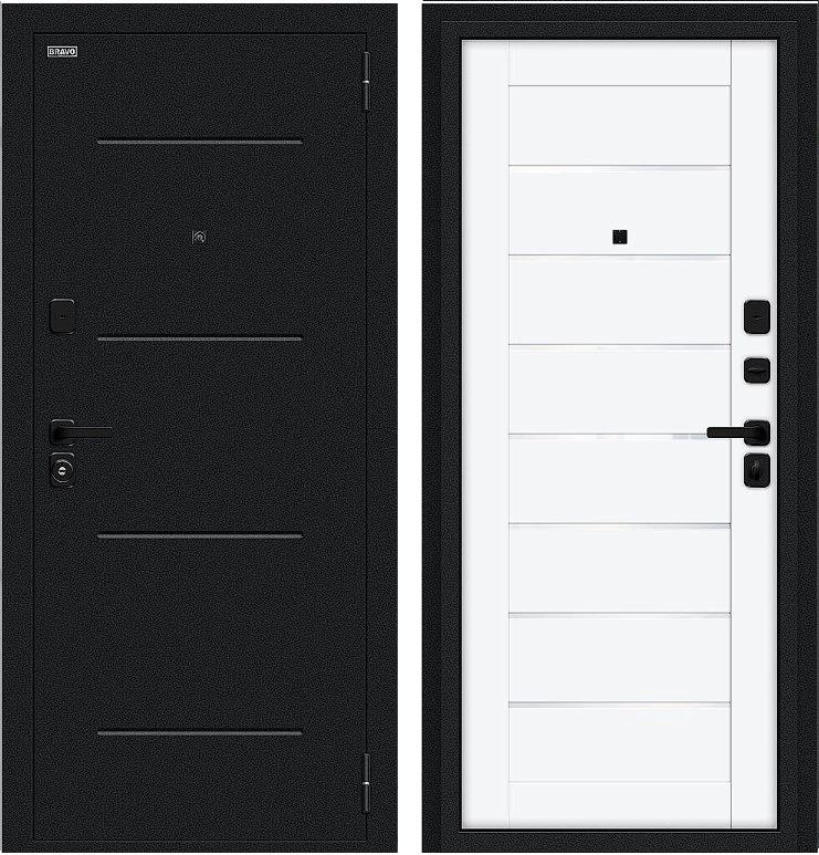 Надежная входная Дверь Браво Техно/SBlack Букле черное/White Silk премиум класса по цене 35 751 руб. Большая толщина стали защитит от проникновения в ваш дом, квартиру или коттедж. Используется очень качественная фурнитура: замки, цилиндры, ручки, защелки. Покрытие и отделка двери изготовлено под внимательным контролем производителя. Дверь имеет долгий срок службы и гарантию.