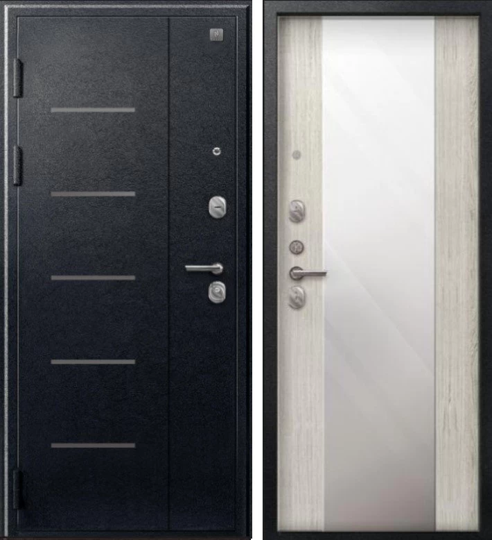 Надежная входная Дверь V-04 Черный муар - Полярный дуб Зеркало премиум класса по цене 43 151 руб. Большая толщина стали защитит от проникновения в ваш дом, квартиру или коттедж. Используется очень качественная фурнитура: замки, цилиндры, ручки, защелки. Покрытие и отделка двери изготовлено под внимательным контролем производителя. Дверь имеет долгий срок службы и гарантию.